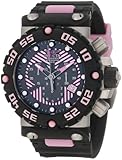 - Black and pink dial with gunmetal, pink and white hands, pink hour markers; luminous; unidirectional black polyurethane bezel with pink arabic numerals; screw-down black and grey crown and pushers